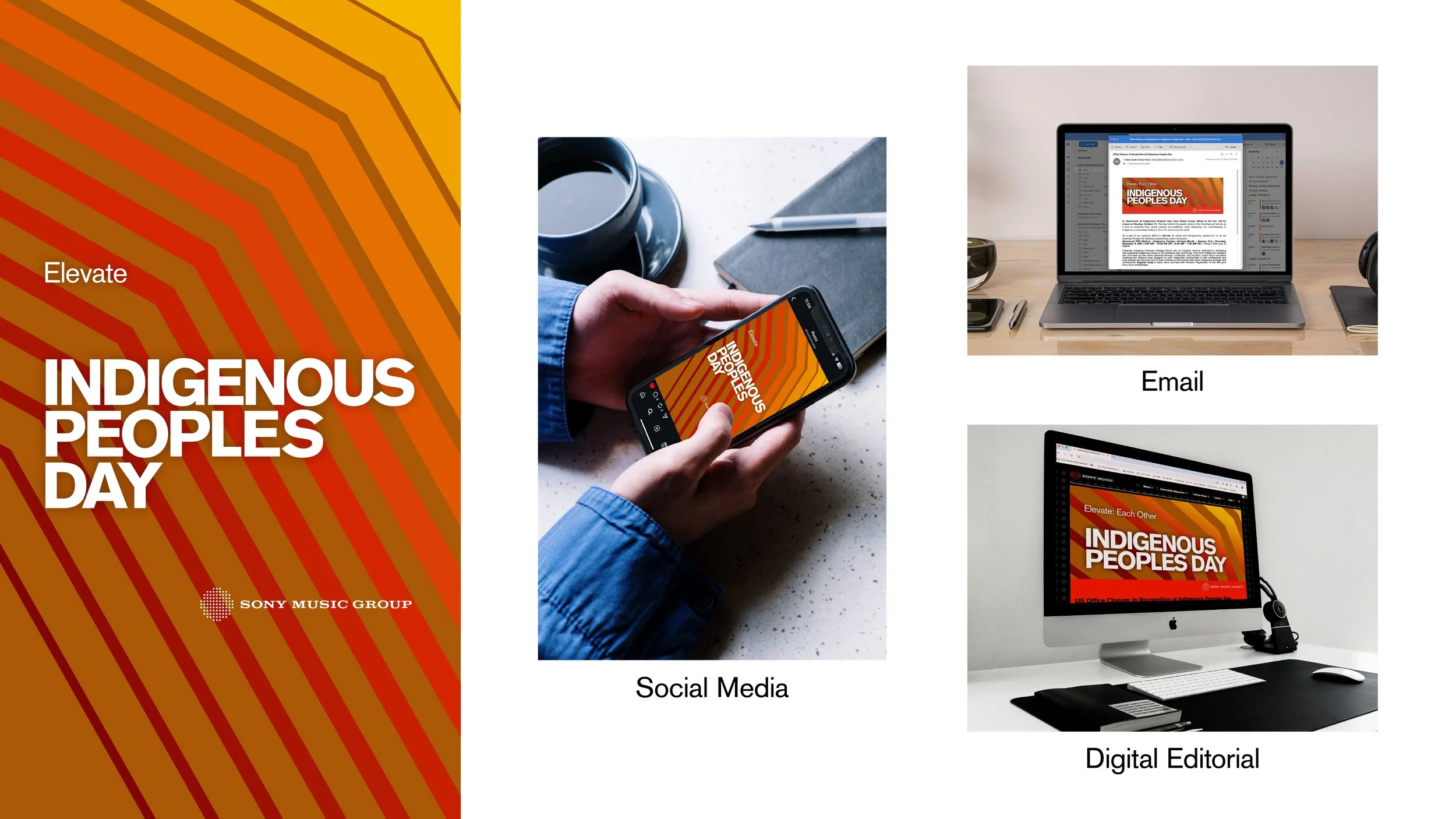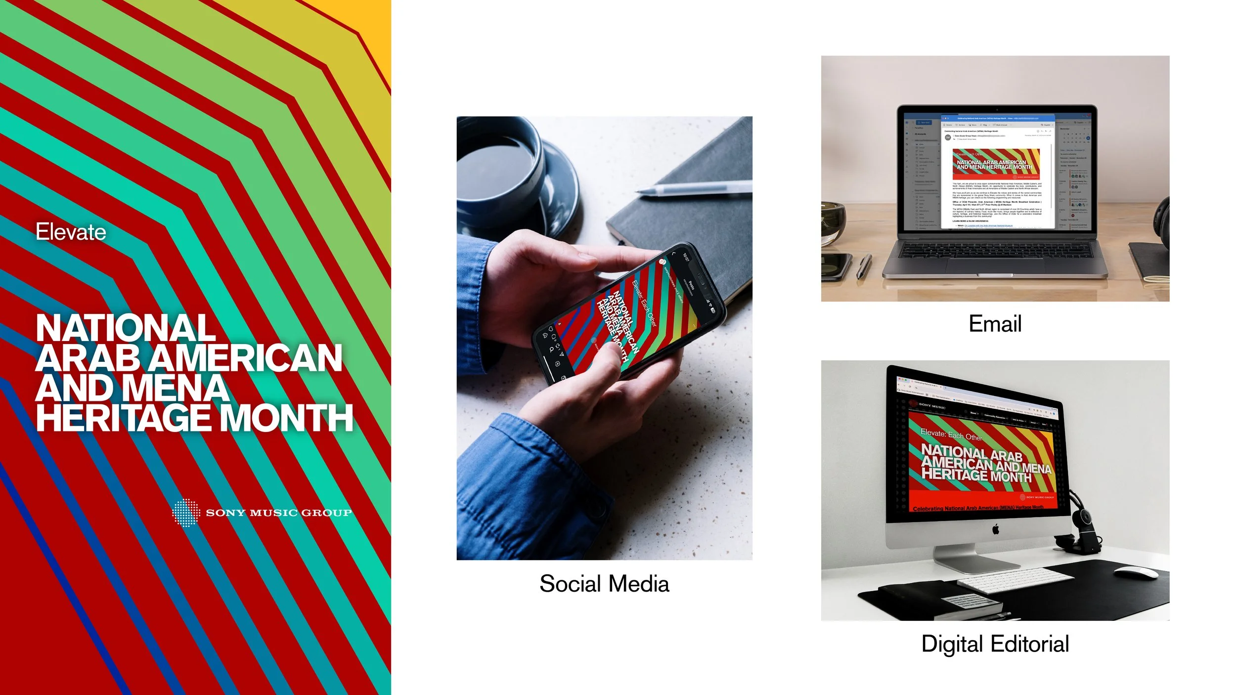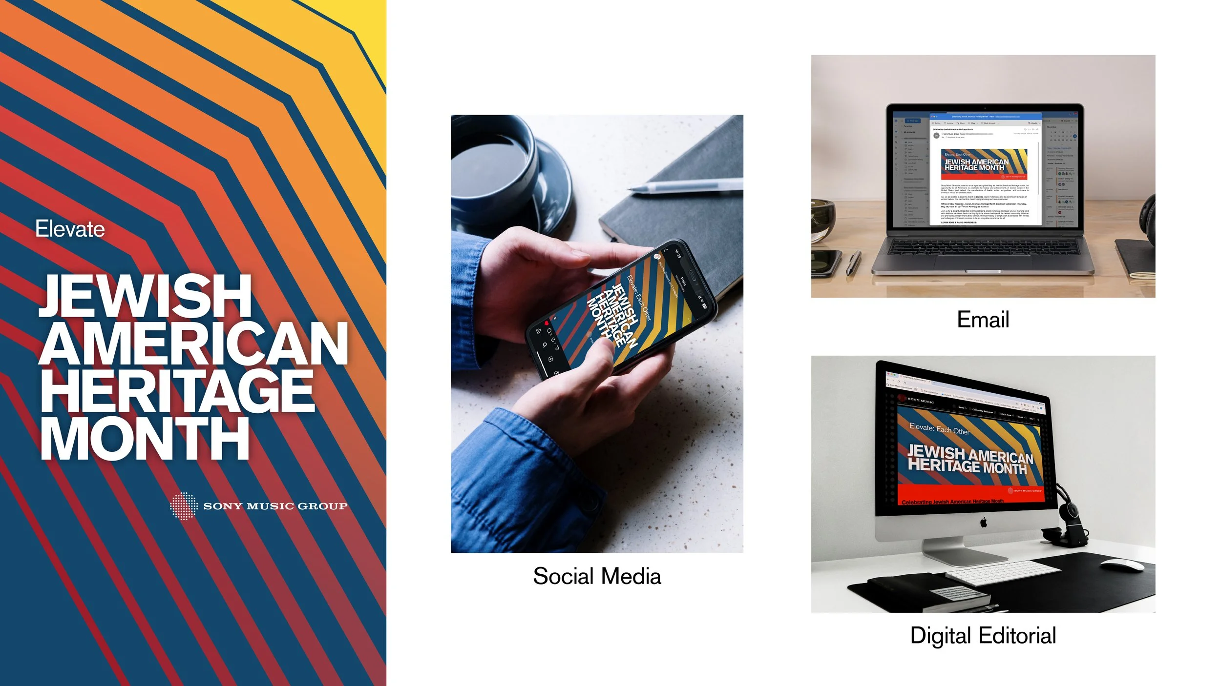For Sony Music Group’s 2025 Heritage Month campaign, I led the art direction and content strategy under the theme “Elevate.” Leaning into the idea of upward motion, I built the visual language around bold chevrons that echoed the theme without feeling literal. I collaborated closely with the DE&I team, who provided cultural and color-palette guidance to ensure the work felt both intentional and inclusive.