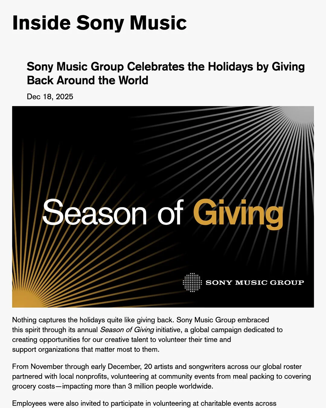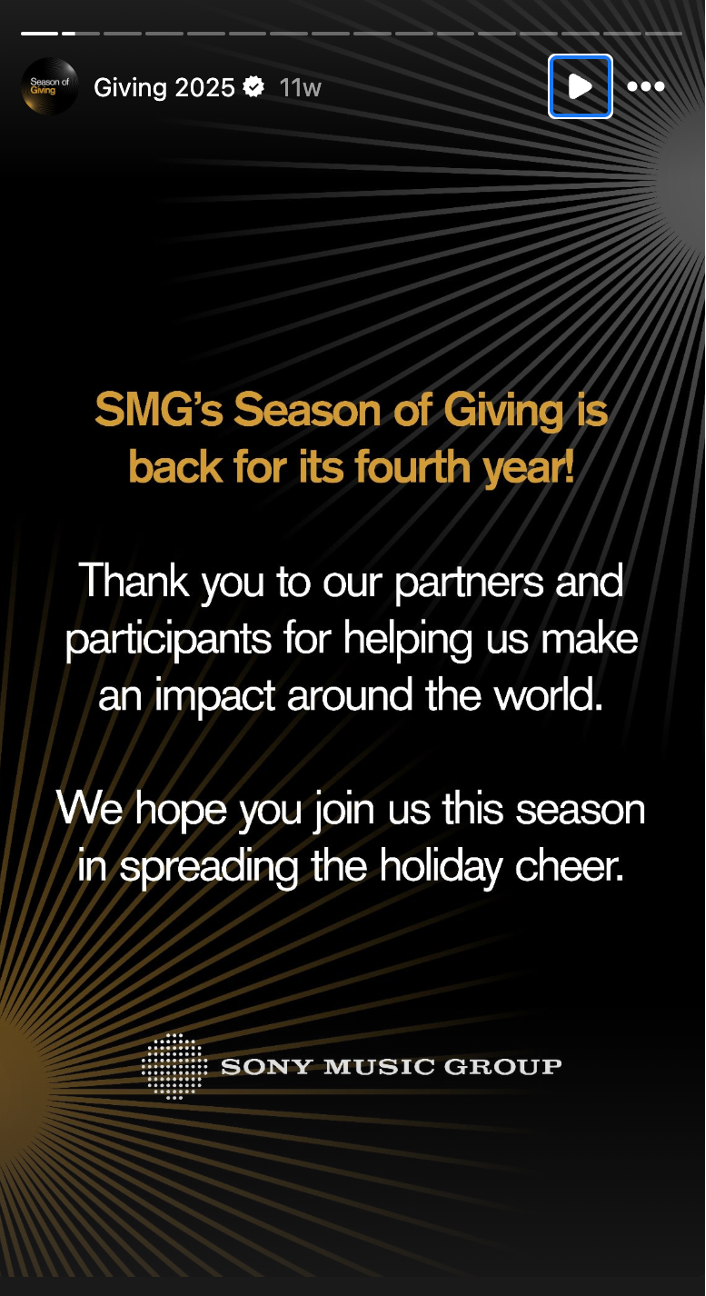 Season of Giving is Sony Music’s global philanthropic initiative connecting artists, employees, and nonprofit partners through volunteer and community-impact efforts. With 30+ artists, 15 charity organizations, and 16 labels and regions involved, the core challenge was showcasing global participation equitably while maintaining narrative cohesion across platforms.
